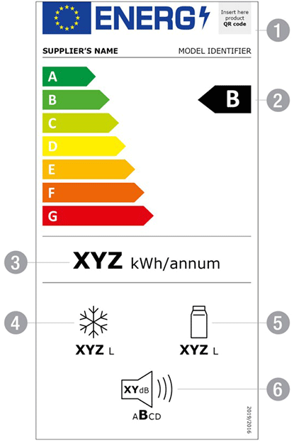 能耗仍以千瓦时的年度数字表示。该标签还提供有关所有冷藏室以及冷藏室(如果适用)的总可用容量以及噪声排放和噪声排放类别的信息。对冰箱和冰柜的新最低要求是,欧盟的效率等级为F,瑞士的效率等级为E,具有内部冷冻室的单门电器除外,其中F也适用。